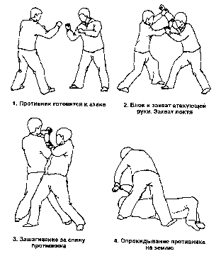 Противник атакует правым кулаком. Вы уклоняетесь от удара, делая шаг левой ногой в сторону. Выполните блок левой рукой и захватите запястье руки оппонента. Своей правой кистью схватите атакующую руку противника возле локтя снизу. Теперь сделайте шаг вперед, и, выворачивая руку оппонента, тяните ее вперед и вниз. Это приведет к опрокидыванию противника на землю. Сгибание руки, вытягивание и выворачивание наружу