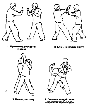 Правой рукой захватите запястье атакующей руки, делая правой ногой шаг вперед. Зайдите за спину противнику и тяните его руку вниз. Это приведет к блокированию плеча и локтя, что в свою очередь вызовет сильную боль. Технику можно окончить броском через бедро. 3: Плечо поворачивается внутрь Сжимание плеча внутрь