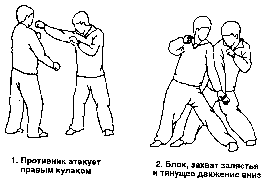 Противник атакует правым кулаком. Выполните блок и захватив запястье его руки, потяните ее вниз и внутрь к центральной линии тела. Правая сторона тела противника будет под вашим контролем, и Вы сможете провести контратаку. В данной ситуации оппонент не может воспользоваться левой рукой, чтобы ударить Вас. К тому же применив любую технику болевого воздействия на локоть или пальцы, можно полностью контролировать тело противника. «Метод запечатывания локтя»