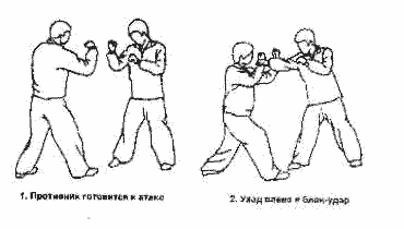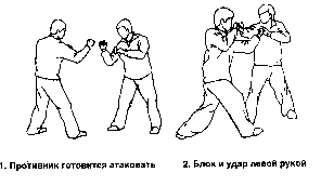 Противник атакует правым кулаком. Сделайте шаг левой ногой вперед с поворотом вправо и нанесите правой рукой удар по локтю оппонента. Захватите запястье противника правой рукой, а левой надавите на локоть снизу вверх. Обе руки действуют одновременно: левая давит вверх, правая тянет вниз. Такое действие заблокирует локтевой сустав. Теперь сделайте шаг назад правой ногой, повернитесь направо и забросьте руку противника на плечо. Сгибая туловище вперед давите на предплечье оппонента вниз. Возможен вариант броска через плечо. Данная техника очень эффективная и приводит к стопроцентной вероятности травмы локтевого и плечевого сустава. «Дикий гусь опрокидывается»