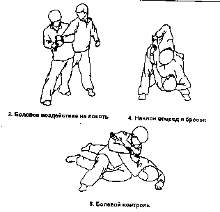 Принцип состоит в следующем: если верхние конечности противника контролируются через их свободные концы (кисть, запястье или предплечье), локоть блокируется нажатием, разделением, опутыванием или крепким обхватом. При этом Вы заставляете локоть сильно разгибаться, что в свою очередь блокирует плечо. Когда сустав разогнут слишком сильно, он повреждается и вместе с ним повреждаются связки, мышцы и соединения между костями и нервами. Если при слишком сильном разгибании использовать выворачивание предплечья, сустав вывихнется в области малой головки лучевой кости. Вращения руки являются результатом движения плеча. Если локоть блокирован и затем вывернут, плечо также будет блокировано. Если плечо блокировано с одного конца руки, а кисть удерживается с другого конца, и при этом прикладывается давление к локтю, очень легко нанести серьезное повреждение в локтевом суставе и взять под контроль все тело противника. Вытягивание локтя прямо назад