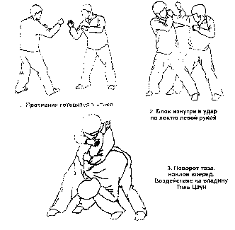 Противник атакует правым кулаком. Вы бьете его по внутренней стороне руки своей правой, направляя ее влево от себя. При этом согните руку так, чтобы защитить голову, если противник нанесет удар левым кулаком. Одновременно сделайте шаг левой ногой так, чтобы она оказалась между ног противника, и левым предплечьем с силой атакуйте локоть оппонента, проворачивая его. Во время удара захватите предплечье противника своей левой кистью и прижмите ею руку к своей ключице, тем самым блокируй локоть. Локтевой изгиб направлен вниз. Теперь быстро повернитесь направо, выпрямляя левую ногу и удерживая предплечье противника на своем плече. Наклонитесь вперед и надавите левым локтем на впадину Тянь Цзун на задней поверхности лопатки оппонента. «Свирепый медведь отрывает свой хвост»