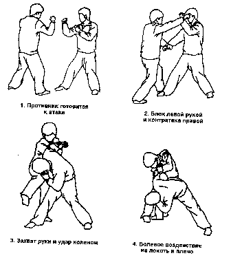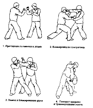 Противник наносит удар правым кулаком. Сделайте шаг левой, ногой вперед, блокируй атаку оппонента движением сверху вниз и нанося правой рукой удар в голову по круговой траектории. Это обманный удар, но он должен выглядеть реально. Противник будет вынужден защищаться, используя левую руку. Не останавливаясь, захватите левой рукой правый локоть противника, выполнив оплетающее движение вокруг его руки. Правой рукой захватите предплечье своей левой руки, выведя ее из-под руки оппонента. Нанесите удар правым коленом в голову или живот противника. Опустите но1у на землю, повернитесь немного направо. При этом левой кистью давите вниз на локтевой сустав оппонента, в то время как ваше левое плечо давит на его предплечье вперед. Противник полностью будет блокирован. «Помогая дождю, омывать раненого»