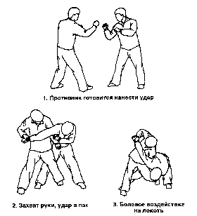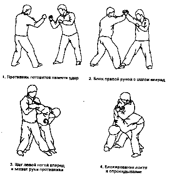 Противник атакует правым кулаком. Сделайте шаг левой ногой вперед, выполните блок правой рукой с внешней стороны и затем захватите запястье оппонента. Потяните захваченную руку противника вправо от себя и вниз. Одновременно левой рукой нанесите удар в пах. Далее поверните тело вправо, продолжая тянуть противника за руку, и надавите левым плечом на его правое плечо. Вытягивание локтя прямо назад