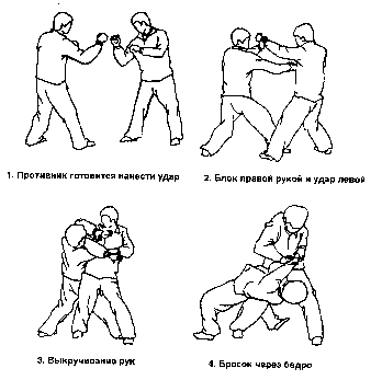 Противник атакует правым кулаком. Сделайте шаг левой ногой вперед в сторону, уклоняясь от удара. Выполните блок правой рукой с внешней стороны и захватите запястье оппонента. Одновременно нанесите своей левой рукой удар в голову. Противник вынужден защищаться, используя свою левую руку. Поверните левую кисть и захватите левую руку оппонента за запястье. Теперь сделайте шаг правой ногой вперед и поверните корпус влево. Поворачиваясь, потяните противника за левую руку па себя и вниз, а его правую руку тяните вперед от себя и затем вниз. Опрокиньте оппонента на землю броском через бедро. «Инь и Ян снова появляются»