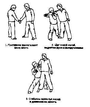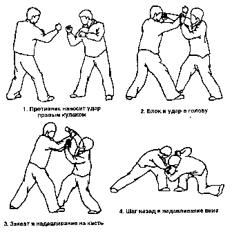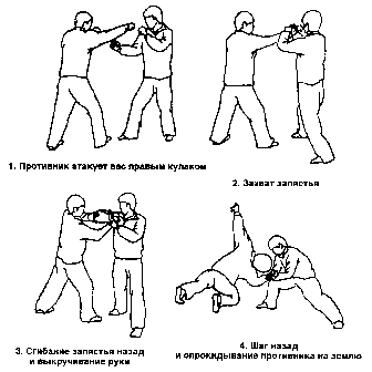 Противник наносит удар правой рукой или пытается схватить вас за одежду. Захватите запястье оппонента своей левой рукой, развернитесь влево и начните выкручивать руку противника наружу. Правой рукой воздействуйте на кисть оппонента, помогая левой выкручивать ее. Далее сделайте шаг назад левой ногой и потяните оппонента за руку на себя и вниз, продолжая ее выкручивать и сгибать запястье назад. Запястье, локоть и плечо противника будут блокированы и он будет вынужден упасть на землю. Сгибание запястья назад и выкручивание локтя внутрь