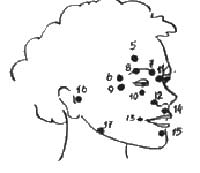 Точка 16 (см.рисунок) — при болях в ушах. ЗОНА17 расположена на одни поперечный палец выше от угла нижней челюсти. Боль при глотании, в зубах нижней челюсти и шум в ушах, вот показания к ее массажу.
