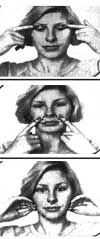 Итак, удобно расположились перед зеркалом. Начинаем с поглаживания лба от средней линии к вискам, затем от внутреннего угла глаза к наружному-по верхнему веку с переходом на нижнее веко по направлению к носу. Oт кончика носа по носо-губным складкам-к углу рта и к козелку уха. На щеках поглаживание начинаем от края глазницы вниз до нижней челюсти. На подбородке поглаживание делаем от средней линии нижней челюсти по направлению к мочке уха, затем по подбородку вниз к передней и боковой поверхности шеи. Растирание выполняют более энергично. Если отдельные участки кожи реагируют на нажим болезненно, согрейте их сначала теплыми ладонями. Разминание следует применить в том случае, когда после растирания еще остались участки мышц, сведенных спазмом. При мышечной слабости, снижении тонуса мышц эффективно сочетание разминания и поколачивания — выполняют поколачивание подушечками пальцев, при этом большие пальцы являются опорой для кисти. По мере продвижения работающих пальцев точки опоры больших пальцев перемещают сверху вниз по нижней челюсти.