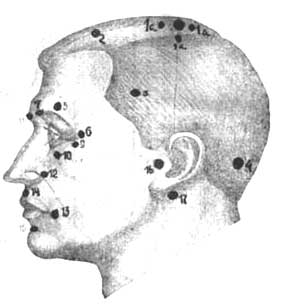 Точка 13 находится на вертикальной линии зрачка, на один поперечный палец в сторону от угла рта. Ее массируют при расстройстве речи, заболеваниях мышц рта, глаз, нервном тике, невралгии тройничного нерва.