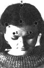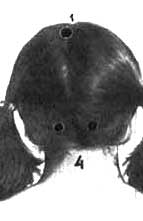 - Если она сосредоточена в теменной области, сопровождается головокружением, шумом в ушах, ощущением не-уверенности и страха-проведите массаж рефлексогенной зоны 1 (см. рис.), которая находится в теменной ямке, на пересечении средней линии головы с линией, соединяющей наружные слуховые проходы.