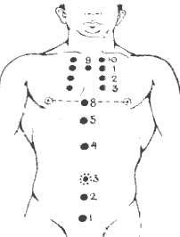 Например: зона 4 (на спине, находится на осевой линии между третьим и четвертым грудными позвонками}- связана с органами дыхания.