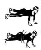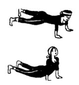 - Полуотжим — лежа на животе, опирайтесь на пол ладонями около плеч. Очень медленно поднимайте голову и плечи, не отрывая бедра от пола. Старайтесь полностью выпрямить руки в локтях. Подбородок прижмите к груди.